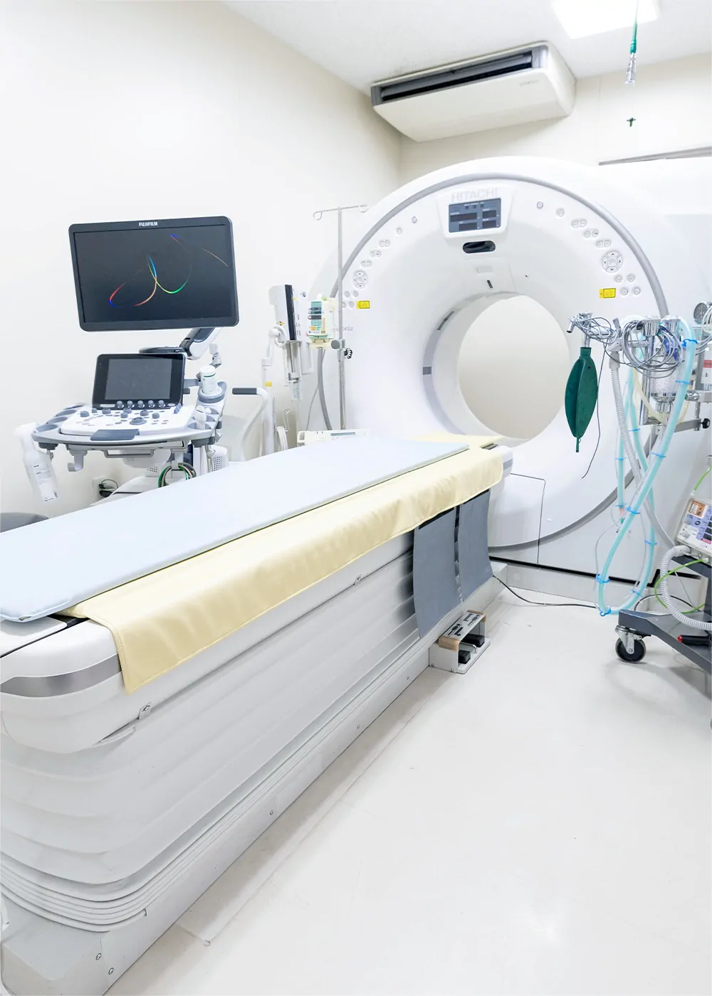 CT検査は通常、全身麻酔下で人工呼吸を行い、呼吸を止めた状態で撮影しますが、動物の状態に応じて無麻酔での対応も行います。検査時間は、不動化してから10分程度と短時間で完了します。目的によっては造影剤を使用することもあり、血管や病変部がより明瞭に映し出されるため、より正確な診断が可能になります。