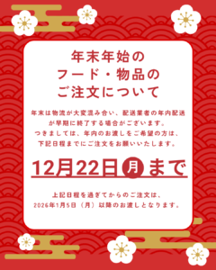 年末年始に向けた物流の混雑に伴い、年内の配送に遅れが生じる可能性がございます。